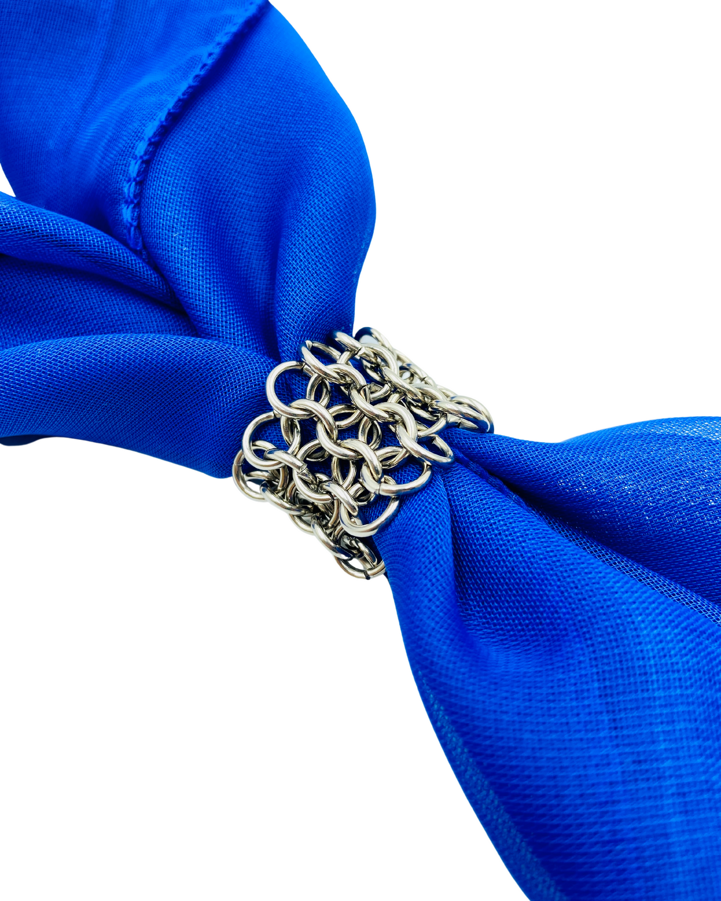 Handwoven from polished stainless steel rings, the Scarf Slide adds a refined touch to classic paisley bandanas. Scarf not included. Perfect for everyday use.