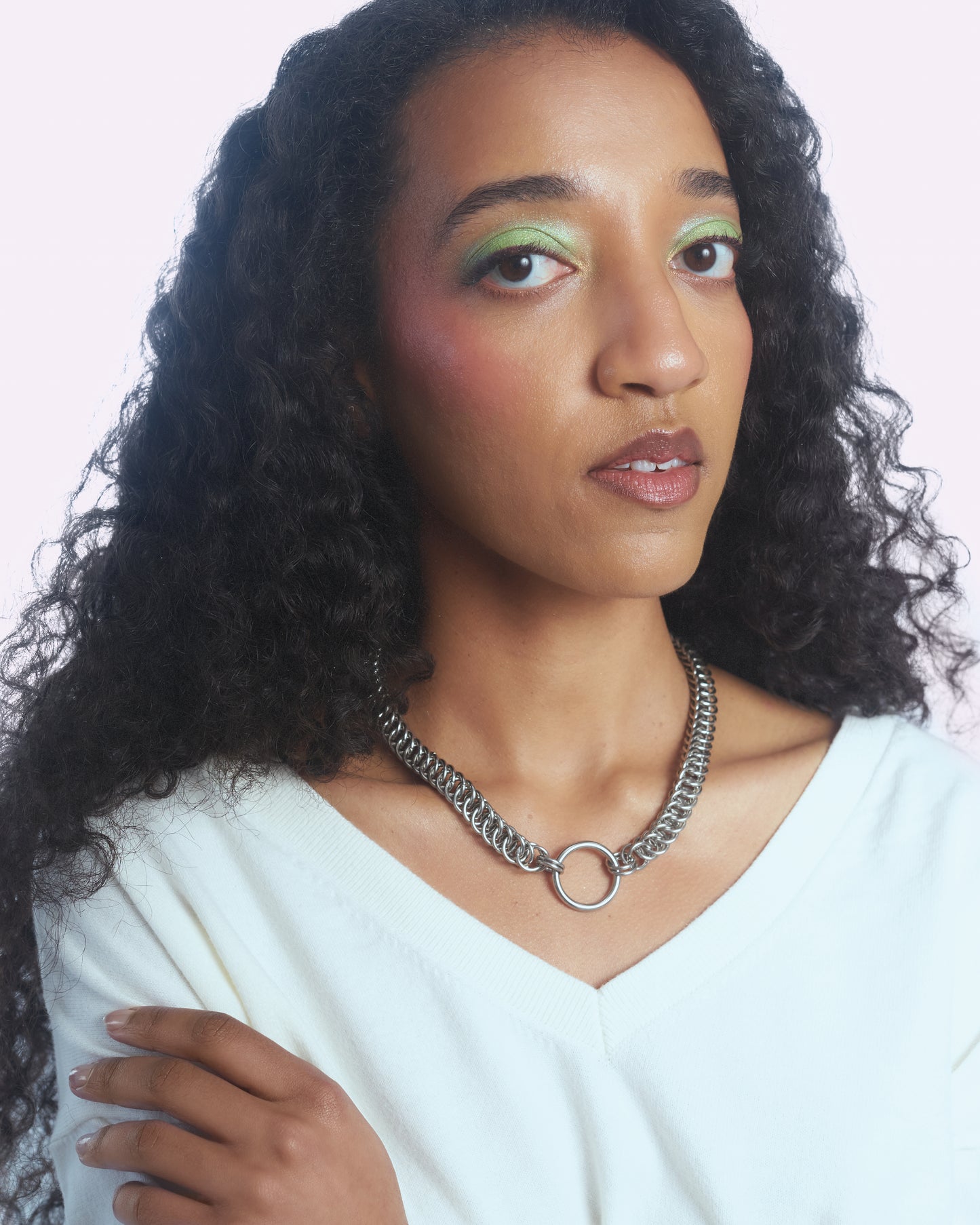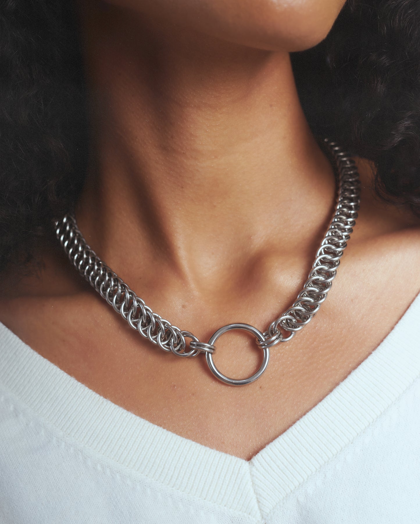 Handwoven from polished stainless steel rings, the Dove Necklace features a stainless steel clasp. Durable and comfortable, designed for everyday wear.