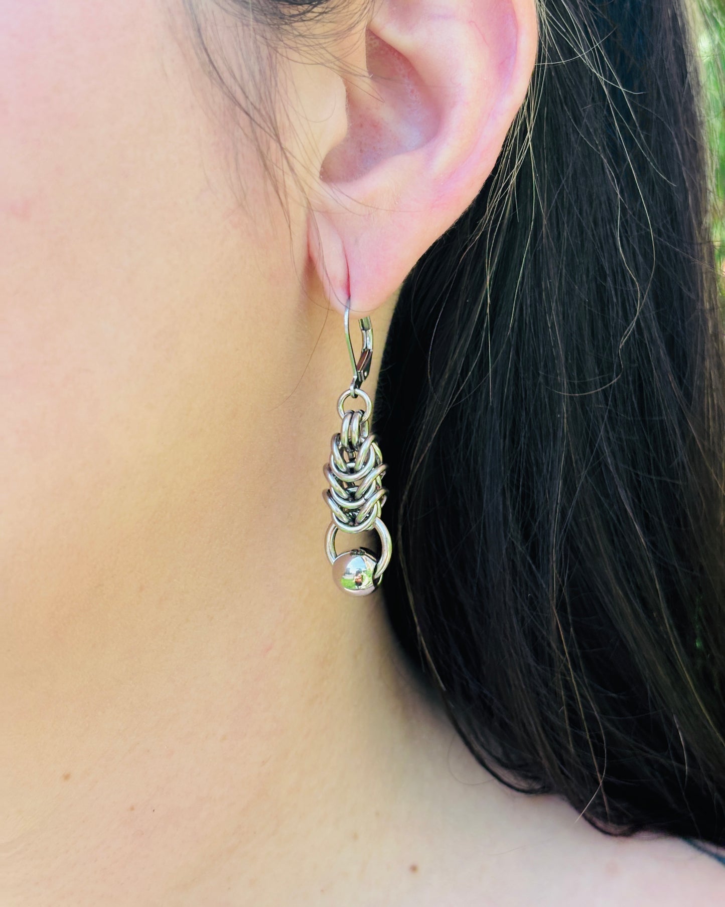 The Kora Earrings are made from stainless steel and feature stainless steel beads, finished with stainless steel leverbacks. Designed to be lightweight and comfortable.