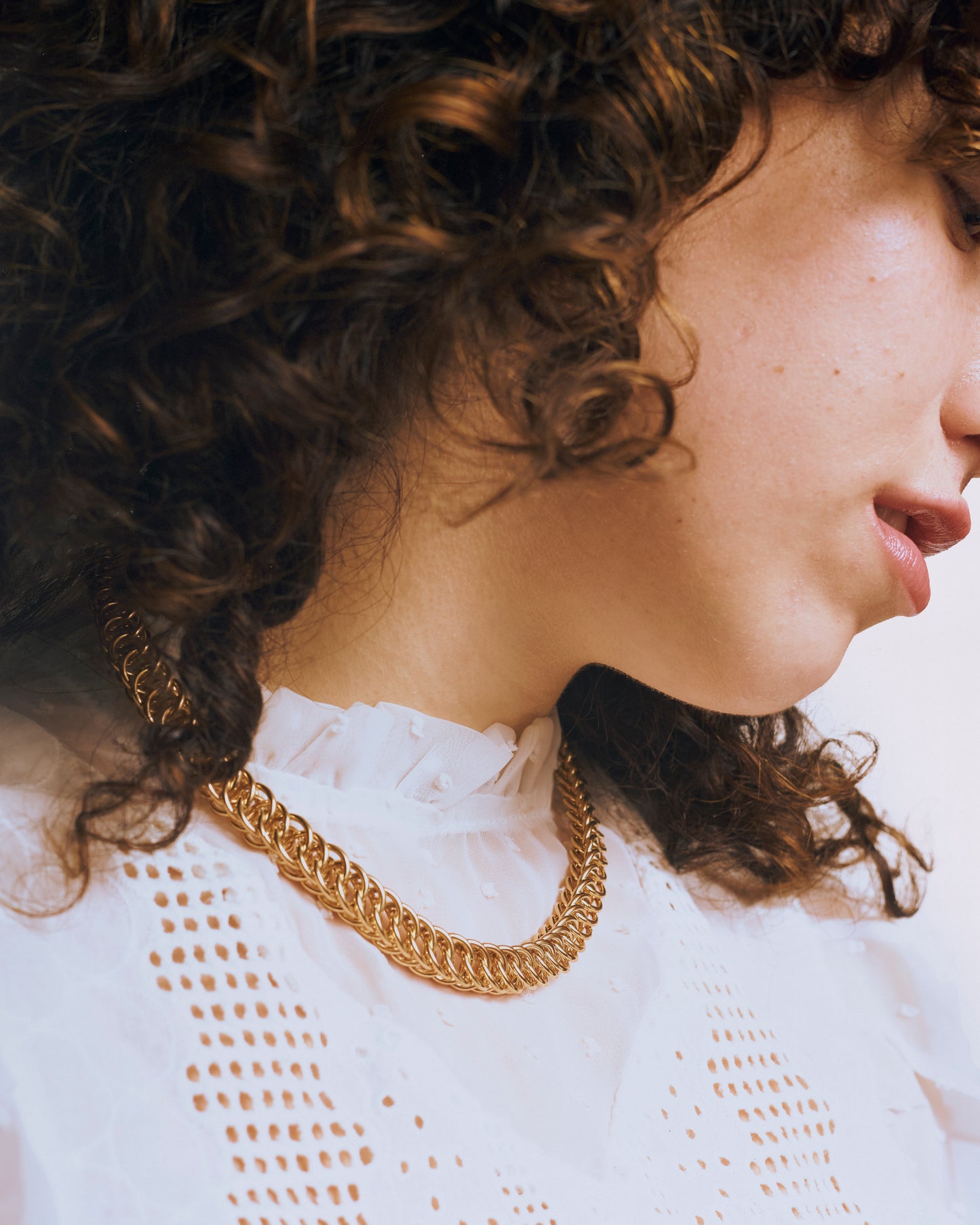 Handwoven from polished jeweler’s brass rings, the Hera Necklace in brass features a gold-plated stainless steel lobster clasp. Durable and comfortable, designed for everyday wear.