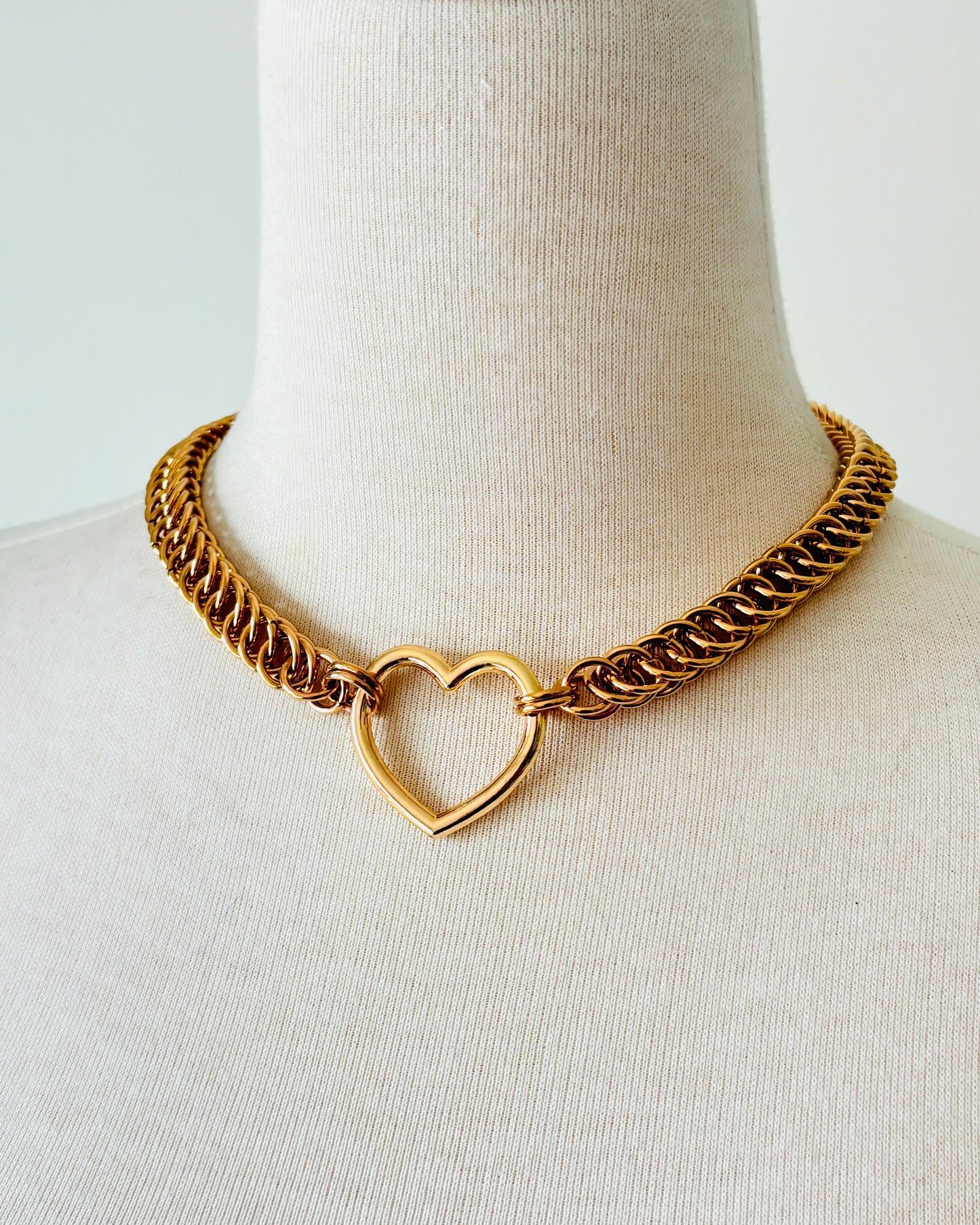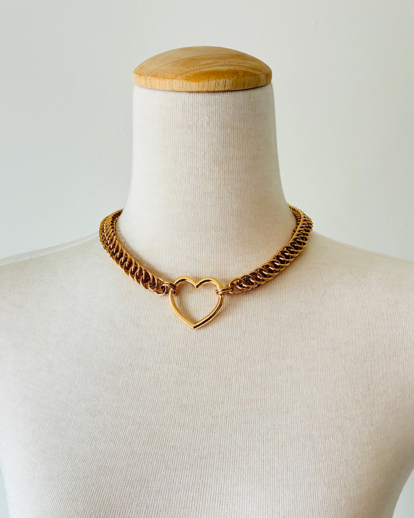 Handwoven from polished jeweler’s brass rings, the Lucia Necklace in brass features a a gold-plated zinc welded heart ring and a gold-plated stainless steel clasp. Detailed and expressive, designed with intention.